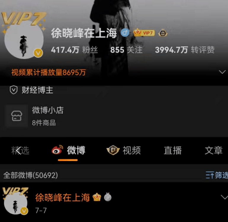 此外,坐拥超400万粉丝的微博大V徐晓峰,在7月7日以后,其微博就已不再更新。