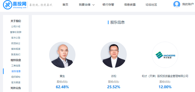 根据喜投网官网上的信息显示,其第一大股东为知名财经大V黄生,持股62.48%;自然人古松持股25.52%,为第二大股东;和才(天津)股权投资基金管理有限公司持股12%,位居第三大股东行列。