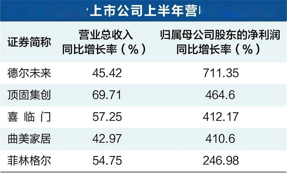 全国家具行业冷暖如何,作为业内规模居前的一类企业,业内上市A股公司的情况颇具说服力。Wind数据显示,申万A股家具行业上市公司中,除了顾家家居和志邦家居外,其他28家公司均已正式披露2021年半年报。进一步的统计表明,上述28家公司中,26家公司营收同比正增长,22家公司归母净利润同比正增长。德尔未来、顶固集创、喜临门、曲美家居、菲林格尔、*ST永林、丰林集团、尚品宅配、美克家居、欧派家居等10家公司归母净利润同比甚至增长超过100%。