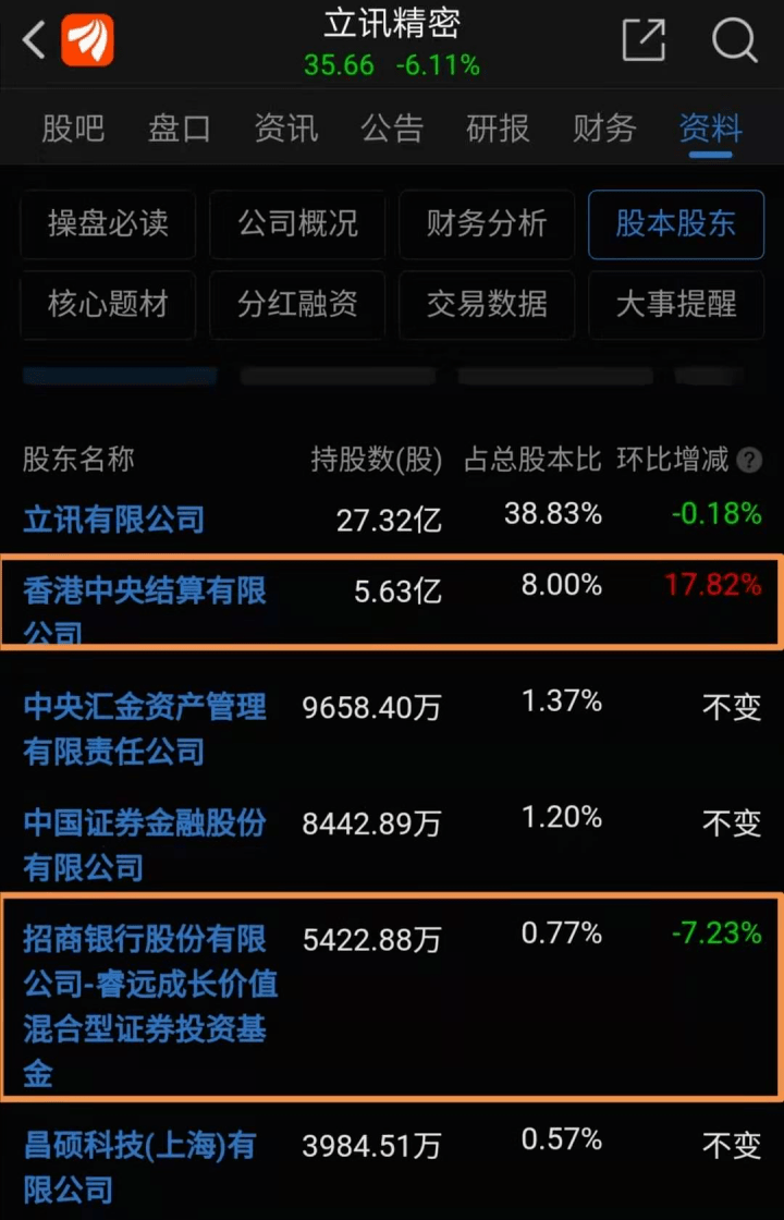 不过半年报显示,北上资金反而在下跌中加仓,截止二季度末香港中央结算持股5.63亿股,比一季度末加仓近9000万股。而明星基金经理睿远傅鹏博执掌的睿远成长价值在一季度新进十大股东后,二季度也只是轻微减仓,立讯精密已跃升为其第一大重仓股。