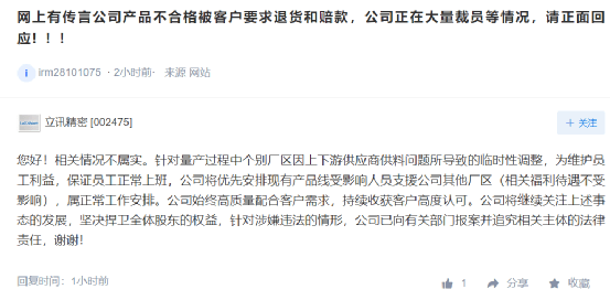 而针对裁员传闻,立讯精密3月26日在互动平台表示,公司不存在裁员的情况,用工及生产情况一切正常。