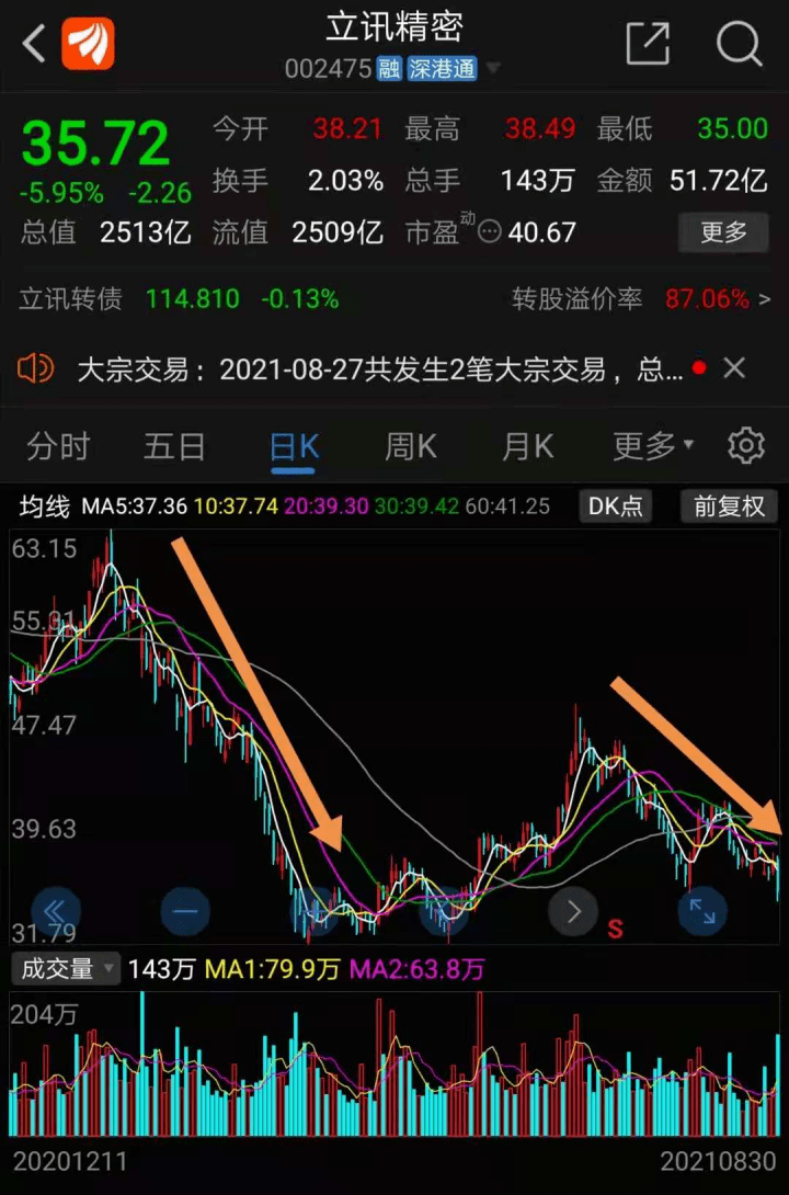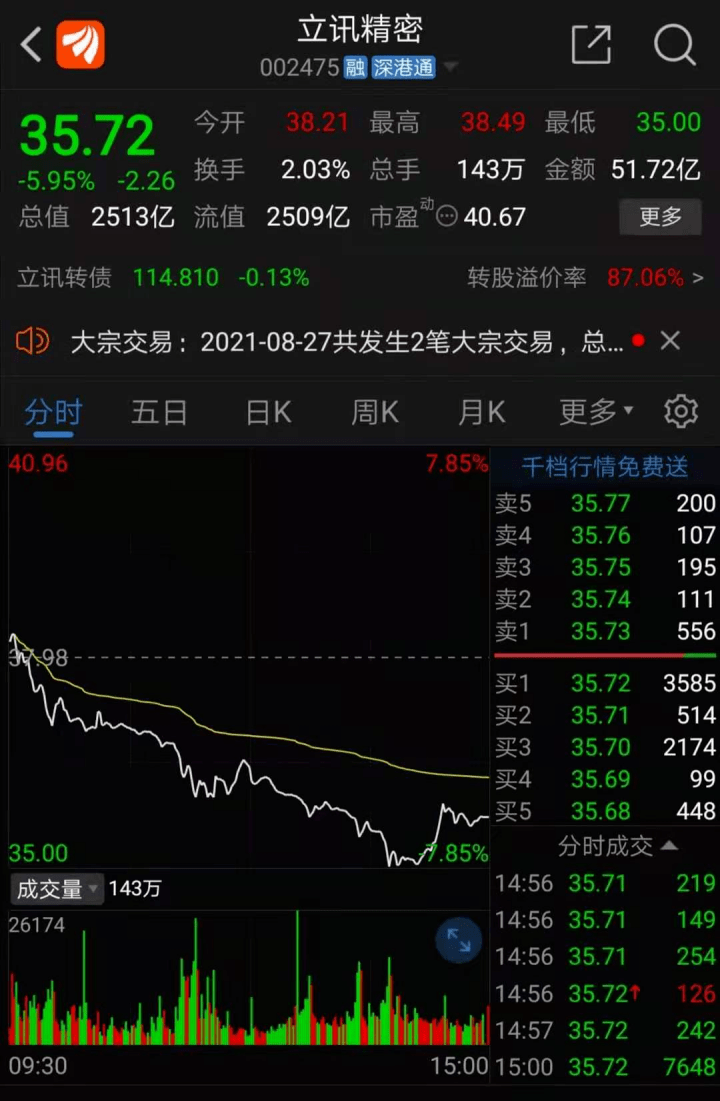 但从股价表现来看,毫无疑问受到影响,立讯精密今早开盘还略微高开,但之后几乎是一路走低,最大跌幅近8%,收市前勉强企稳,最终下跌5.95%报35.72元。