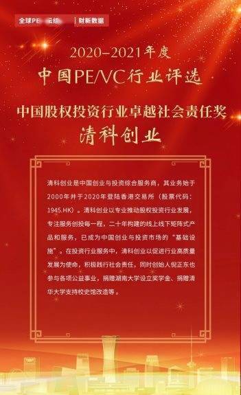 阅读全文 清科创业荣获2020-2021年度中国PE/VC行业评选“中国股权投资行业卓越社会责任奖”