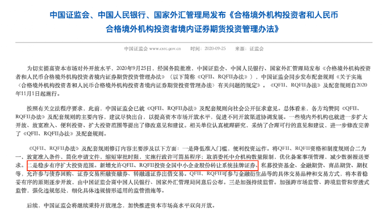 2020年9月,中国证监会、中国人民银行、国家外汇管理局发布《合格境外机构投资者和人民币合格境外机构投资者境内证券期货投资管理办法》,即QFII新规。新规拓宽了QFII的投资范围,新增允许QFII、RQFII投资全国中小企业股份转让系统挂牌证券等。QFII投资新三板股票原则上已无政策性障碍。