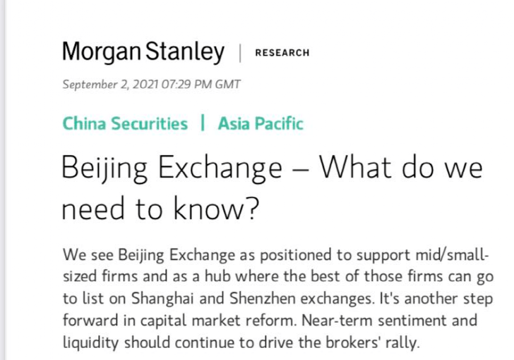 摩根士丹利9月2日就北京证券交易所设立紧急发表研究报告指出,北京证券交易所的设立是为了扶持中小型企业发展。未来,北京证券交易所一部分优质公司可能会转到沪深交易所上市。摩根士丹利解读认为设立北京证券交易所是中国资本市场改革深化的举措,是中国多层次资本市场建设的一部分,也是中国资本市场注册制改革的一部分,有助于资本市场发挥直接融资功能。