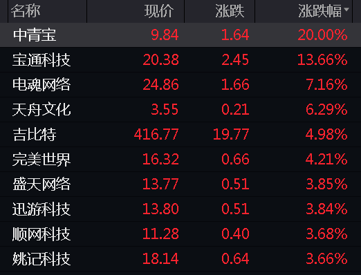 超跌游戏股持续回血, 中青宝直接收利好消息刺激,收20%涨停。