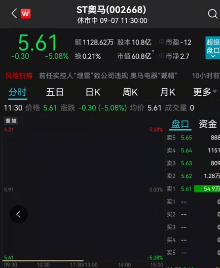 奥马电器 复牌一字跌停,跌停板上还有近55万手排队卖出。