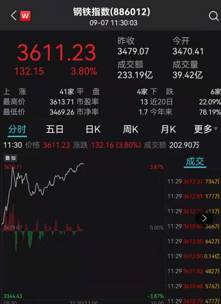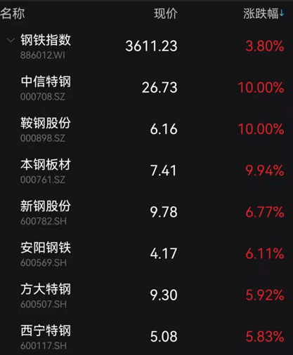 钢铁板块亦并驾齐驱。指数大涨3.8%。 中信特钢 、 鞍钢 、 本钢板材 等涨停