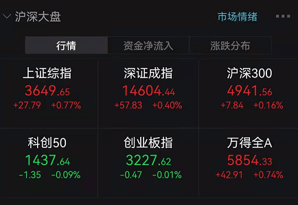 上证指数午盘涨0.77%,创业板指跌0.01%,Wind全A指数涨0.74%。