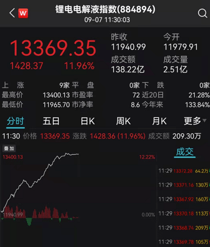 其中,锂电电解液指数大涨近12%。