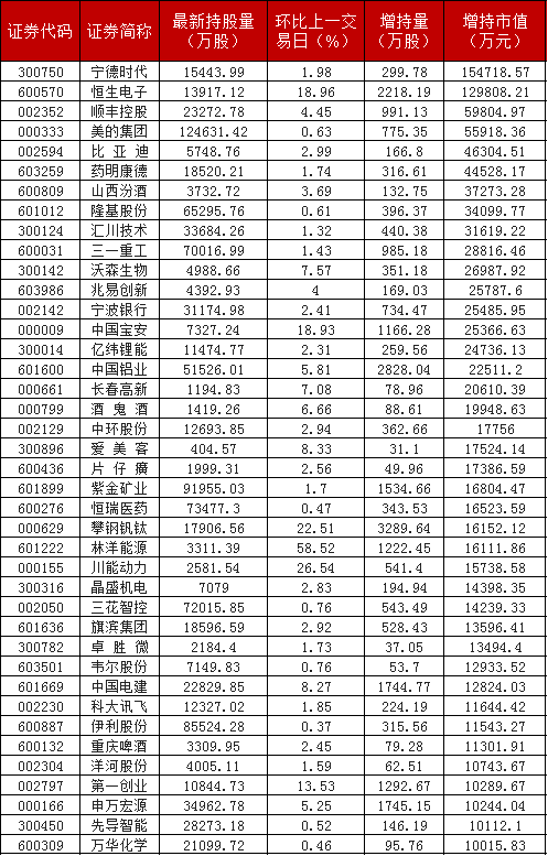 根据同花顺iFinD数据统计,回顾当日变动情况,有709股持股量环比上一个交易日增加,其中加仓市值超亿元的有40股,其中宁德时代、恒生电子、顺丰控股、美的集团、比亚迪、药明康德、山西汾酒、隆基股份、汇川技术、三一重工、沃森生物、兆易创新、宁波银行、中国宝安、亿纬锂能、中国铝业、长春高新的增持市值均在2亿元以上。