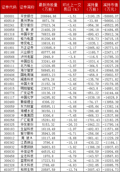北向资金亿元减持名单