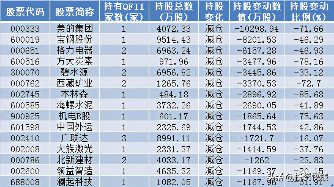 随着中报披露收官,外资的布局情况成为投资者关注的焦点。QFII二季度减持了99只个股,有15只个股更是被减持超过1000万股。其中,遭QFII减持股数最多的是美的集团,达到10298.94万股。