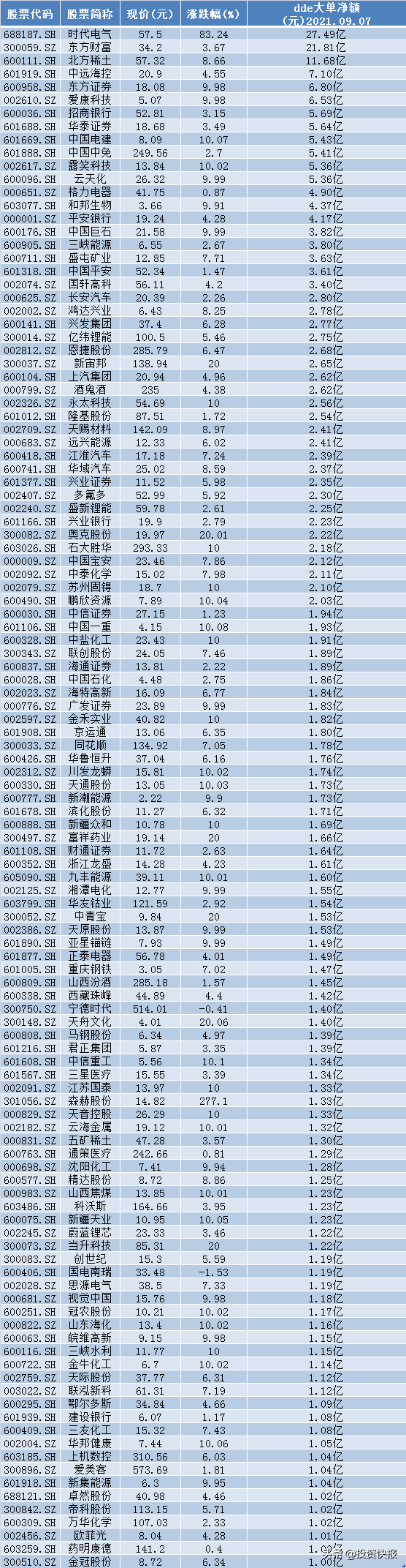 据统计,9月7日共有117只个股遭DDE大单净额流入超亿元,合计306亿大单DDE净额资金。最受主力资金青睐的是时代电气、东方财富、北方稀土,大单净流入额均超10亿元,分别为27.49亿元、21.81亿元、11.68亿元。