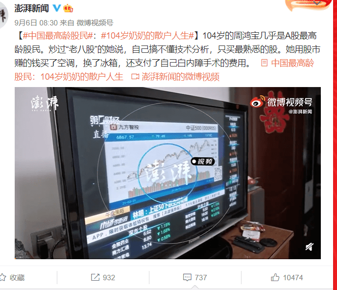 另外,近日刷屏的还有104岁的周鸿宝老奶奶,几乎是A股最高龄股民。