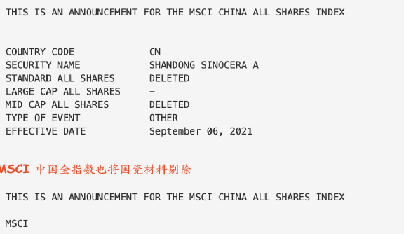 据MSCI官网,MSCI全球标准指数系列已将国瓷材料剔除,9月6日(周一)已生效。与此同时,MSCI中国全指数也将国瓷材料剔除了,同样是9月6日生效。