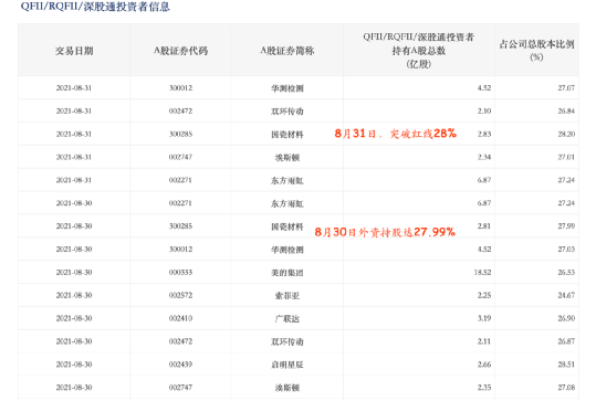 这三只股票分别为双环传动、国瓷材料、启明星辰。此前,三只股票分别独自突破过28%的外资持股红线,9月3日三只首次同时突破。