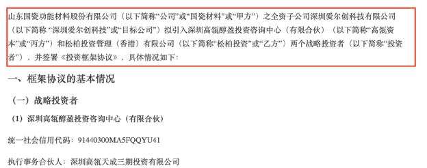 2020年9月16日,国瓷材料发布了公告称全资子公司深圳爱尔创科技有限公司拟引入高瓴资本、松柏投资两个战略投资者,并签署《投资框架协议》,后二者将以不超过5亿元增资深圳爱尔创科技、不超过2亿元受让公司持有爱尔创股份的方式对其进行投资,此次拟获增资的爱尔创是国瓷材料全资子公司。