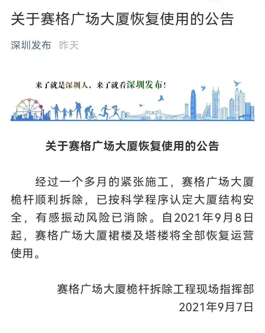 据深圳发布微信公众号消息,经过一个多月的紧张施工,赛格广场大厦桅杆顺利拆除,已按科学程序认定大厦结构安全,有感振动风险已消除。自2021年9月8日起,赛格广场大厦裙楼及塔楼将全部恢复运营使用。