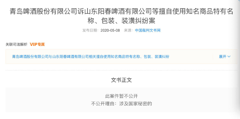 天眼查数据显示,2020年5月,中国裁判文书网发布《青岛啤酒股份有限公司诉山东阳春啤酒有限公司等擅自使用知名商品特有名称、包装、装潢纠纷案》,但因涉密并未公开文书。