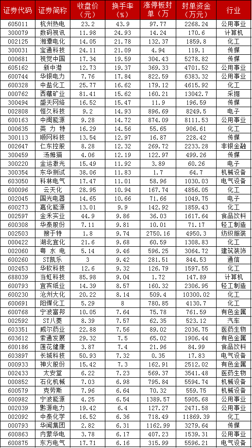 另一方面,根据同花顺iFinD数据显示,今日涨停股换手率最多的分别是杭州热电、湘潭电化、宝通科技、视觉中国、新中港、华银电力、中盐化工、西藏矿业、盛天网络、恒久科技、中闽能源、英力特、顺网科技、仁东控股、汤姆猫、金运激光、东华测试、科林电气、云天化,均在10%以上。
