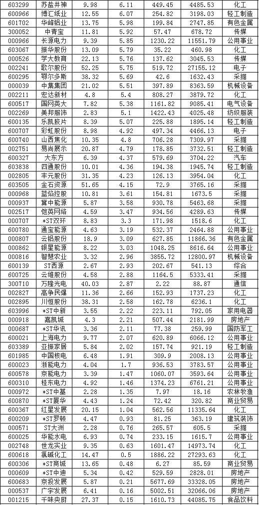 换手率越高说明交投活动极其活跃,杭州热电今日换手率高达33.14%,远超榜二数码视讯的24.93%和榜三湘潭电化的21.78%,电力光伏受到利好刺激,整体掀起涨潮。杭州热电在环保炒作逻辑以及中报增长等多重因素推动,股价从平开到上板,板上封单资金2268万元,全天换手率高达43.9%,公司上半年实现营业收入13.92亿元,同比增长52.40%,归属于上市公司股东的净利润为1.34亿元,同比增长62.33%,净利润大幅跑赢行业平均增长率3.62%。