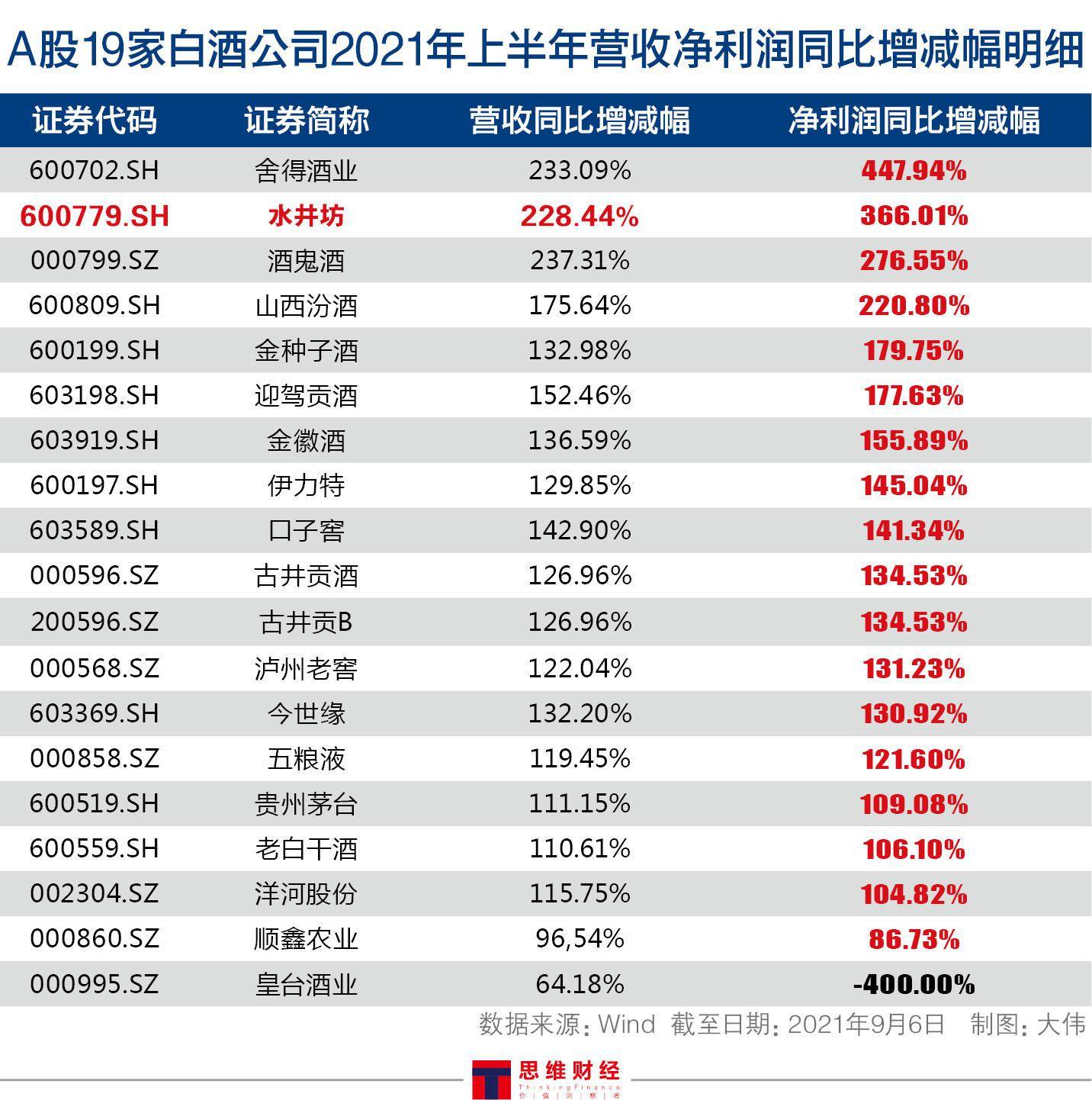 从上表可以看到,截至9月6日收盘,A股19家白酒公司中,水井坊的涨幅高居第二,仅次于舍得酒业。