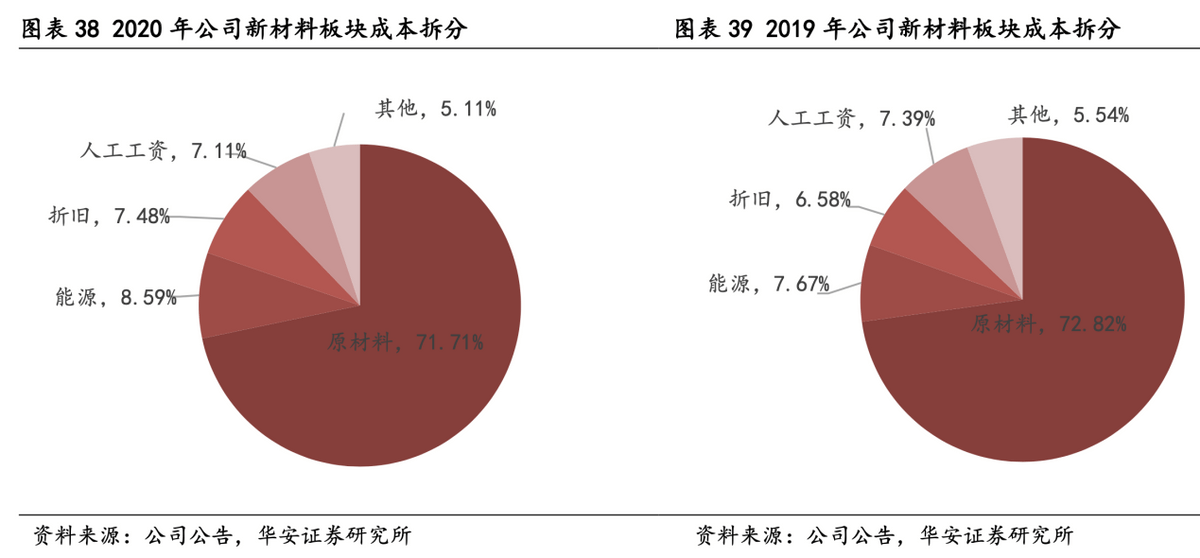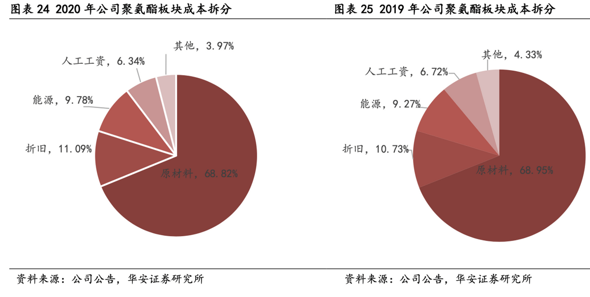 据华安证券统计,万华化学聚氨酯板块、石化板块新材料板块的成本大头均为原材料,去年分别占各板块成本的68.82%、85.95%、71.71%。