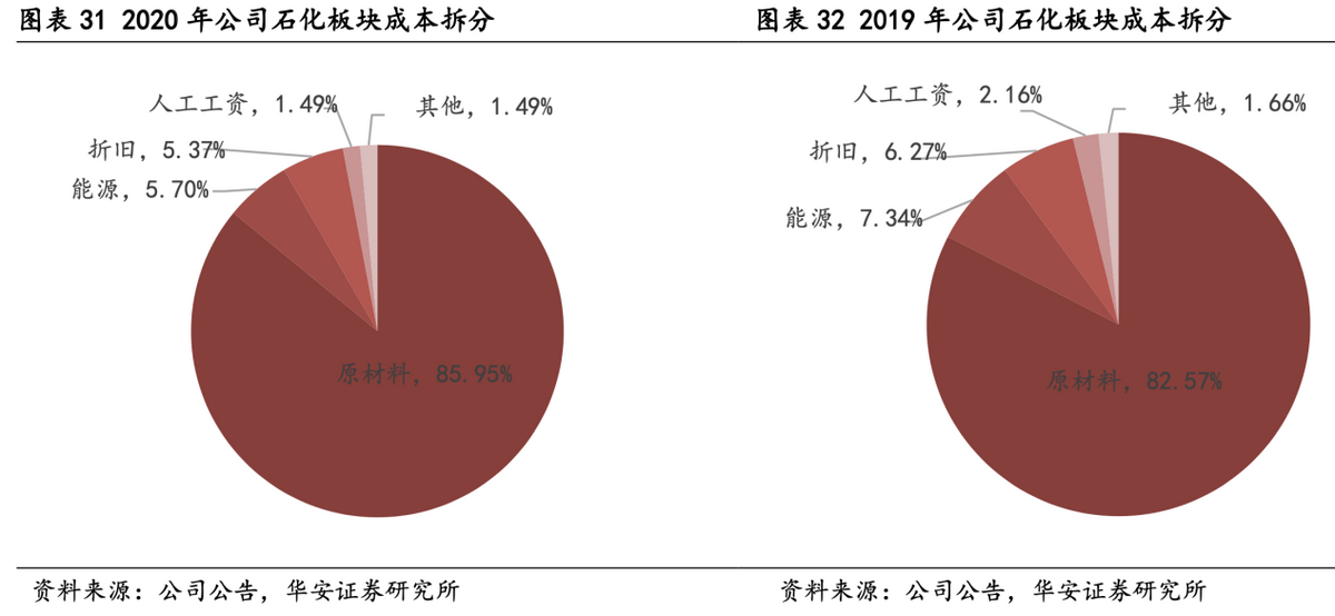 石化板块成本方面,2020年原材料、能源、折旧、人工工资分别占比85.95%、5.70%、5.37%、1.49%。与去年同期相比,石化板块原材料占比上升3.38%,能源、折旧、人工工资占比分别下降1.64%、0.90%、0.67%。