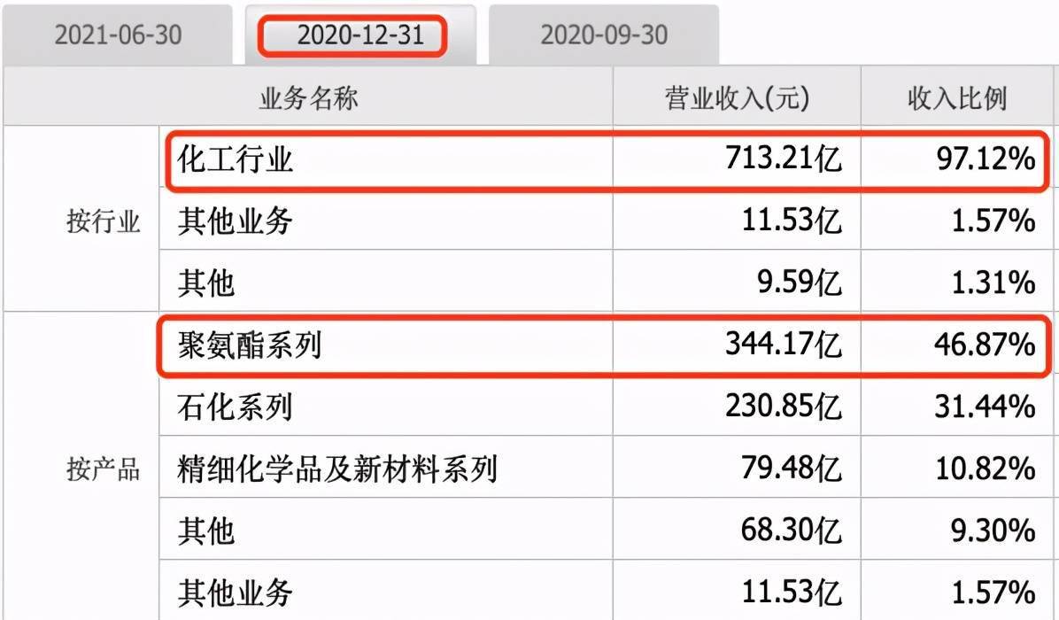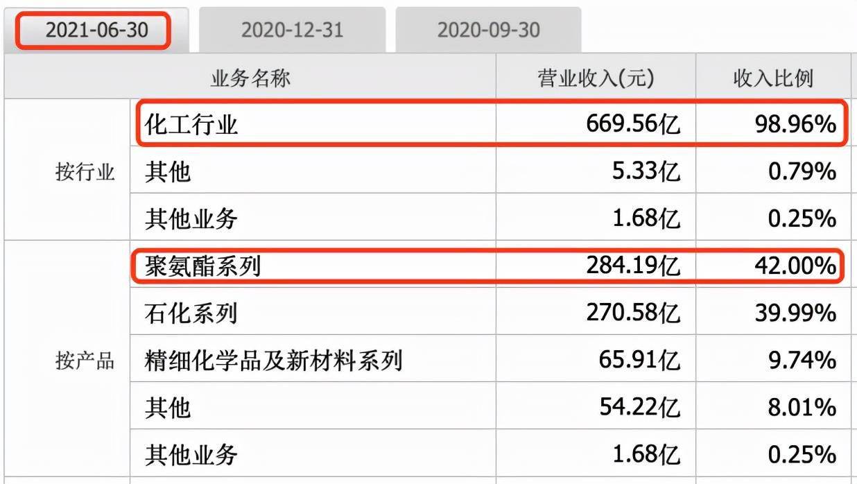 2021年上半年,聚氨酯系列产品为万华化学贡献了284.19亿元的营收,占营业收入的42%,同比大增111.78%,是公司主要收入来源。