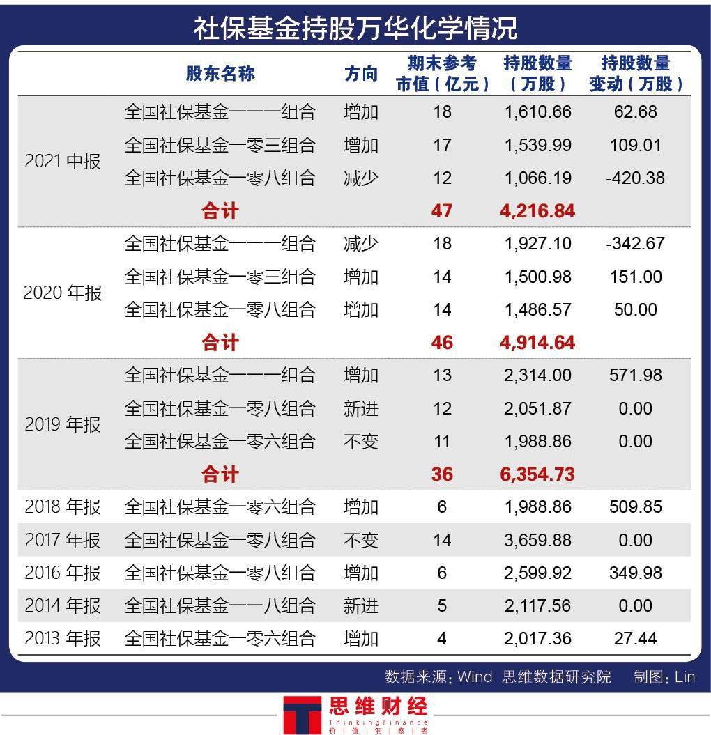 据Wind统计,自2013年起,社保基金再次出现在万华化学的十大流通股东名单中,并且持续至今年二季度,具体细节如下表: