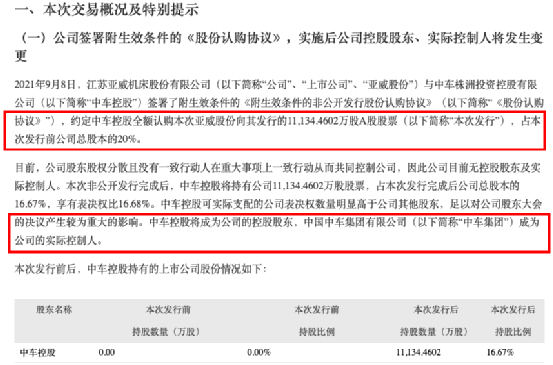 昨晚,亚威股份发布公告称,中车控股全额认购本次向其发行的 1.1 亿股 A 股股票,占本次发行前公司总股本的 20%;本次非公开发行完成后,中车控股将成为公司的控股股东,中国中车集团有限公司成为公司的实际控制人。