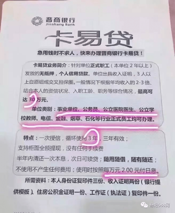据了解,2015年3月份,晋商银行曾推出的一款个人循环贷款业务“卡易贷”,贷款额度为5-30万元,该业务周期为36个月,每六个月将期间所用贷款及利息还清后,能够继续使用其贷款。