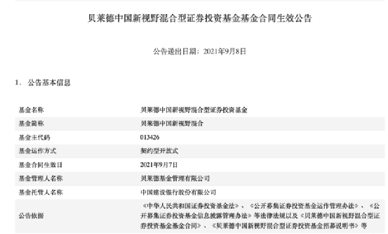 根据公告,贝莱德基金首只公募基金产品—贝莱德中国新视野混合型证券投资基金,获中国证券监督管理委员会确认基金备案手续,并已于9月7日正式成立,首募规模约66.81亿元,有效认购总户数为11.1万户。