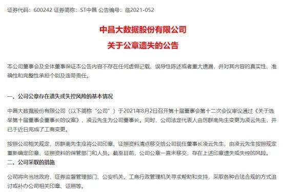 9月9日晚间,ST中昌公告,8月2日新董事长上任,法人也换了,但到现在原来的董事长、法人还没移交相关印章和证照。