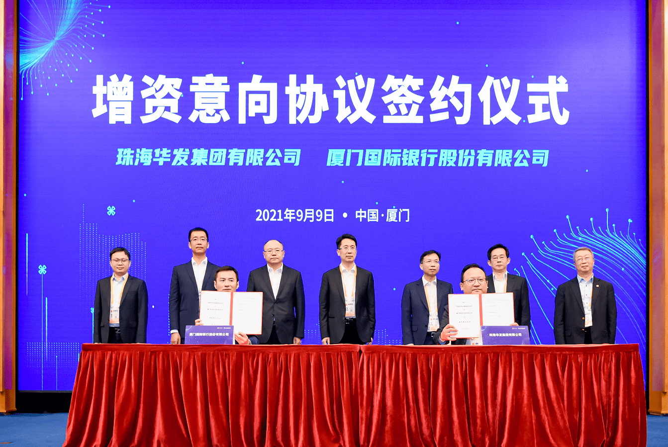 9月9日,厦门国际银行股份有限公司(以下简称“厦门国际银行”)与珠海华发集团有限公司(以下简称“珠海华发集团”)签订增资意向协议。因经营需要,厦门国际银行初步计划面向特定投资者开展定向增资,珠海华发集团拟认购厦门国际银行本次定向增资拟发行的一定数量股份,经友好协商,就其拟认购厦门国际银行拟发行股份的相关事宜,与厦门国际银行达成增资意向协议。珠海华发集团代表、厦门国际银行代表出席签约,珠海华发集团及厦门国际银行相关领导现场共同见证签约。