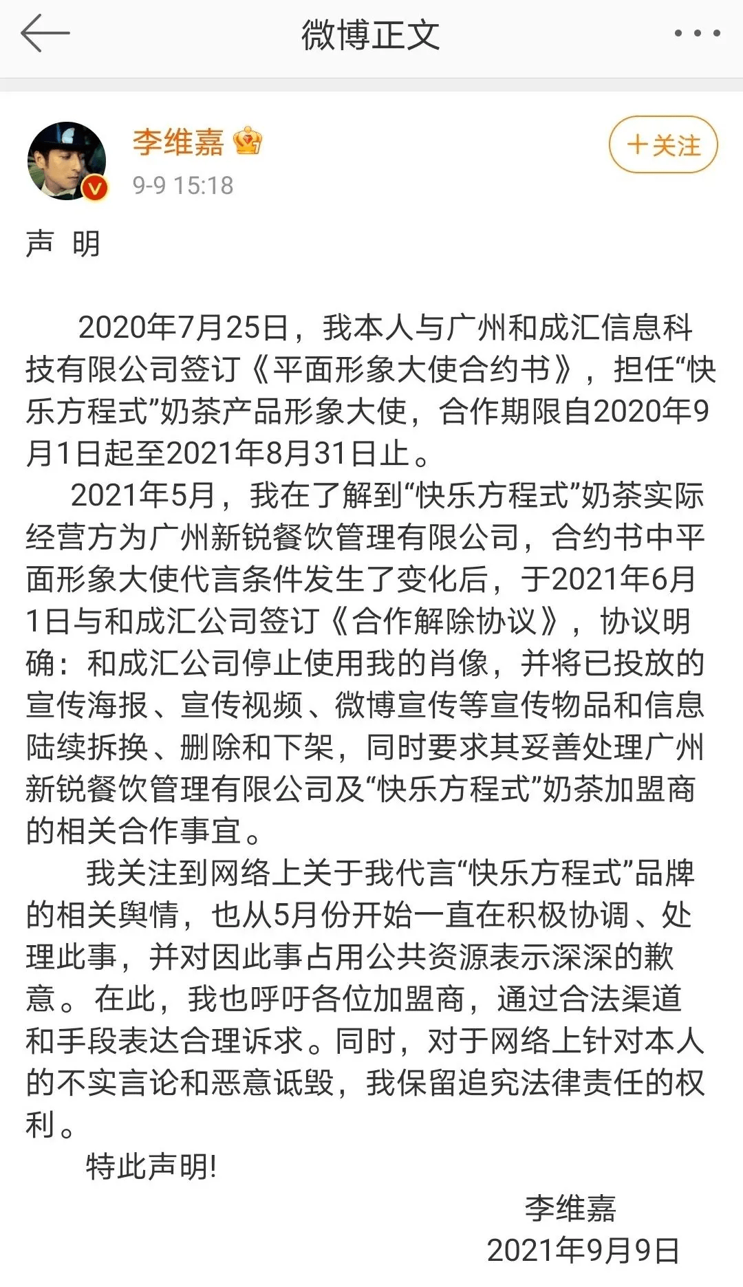 值得关注的是,据最新消息,李维嘉回应称:2021年6月已解除合同,停止代言“快乐方程式”奶茶,请加盟商合法维权,禁止网络中的不实言论和恶意诋毁!