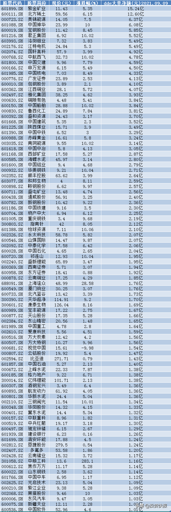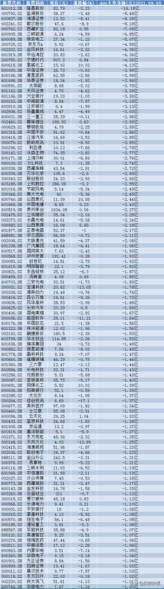 9月9日大单净流出超1亿元的个股: