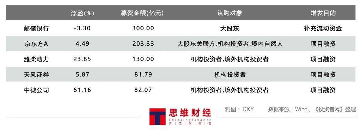在这些增发中,86家企业的增发有大股东、大股东关联方或公司其他股东认购。其中大股东参与的增发就有63家,合计认购了640多亿元的新发股份,仅邮储银行(601658.SH)、贵州轮胎(000589.SZ)以及同方股份(600100.SH)等大股东参与的增发,在账面上出现了小幅亏损,其他的60家均有盈利,有两家企业的增发目前账面浮盈已超过了10倍。