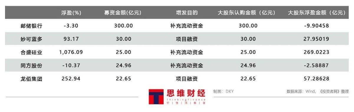在认购规模方面,邮储银行增发规模大,大股东认购的比例也高。不过目前银行板块走势低迷,认购邮储银行增发股份的大股东目前在账面上出现了小幅亏损。妙可蓝多(600882.SH)、合盛硅业等合计有36家企业的增发大股东100%认购,认购的规模接近570亿元,仅邮储银行一家就达到了300亿元。