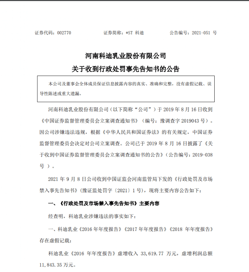 9月9日晚间,河南科迪乳业股份有限公司(以下简称“科迪乳业”)发布《关于收到行政处罚事先告知书的公告》。经河南证监局查明,科迪乳业在2016年至2018年,累计虚增收入8.43亿元,、虚增利润3亿元;且未按规定履行在2016年至2019年有关临时信披义务,在2016年至2018年年报中存在重大遗漏。