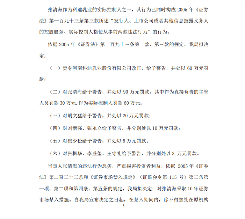 依据 2005 年《证券法》第一百九十三条第一款、第三款的规定,中国证监会河南监管局做出以下决定:责令河南科迪乳业股份有限公司改正,给予警告,并处以 60 万元罚款;对张清海、胡文猛、刘新强、张永立、崔少松等人分别给予警告并罚款。