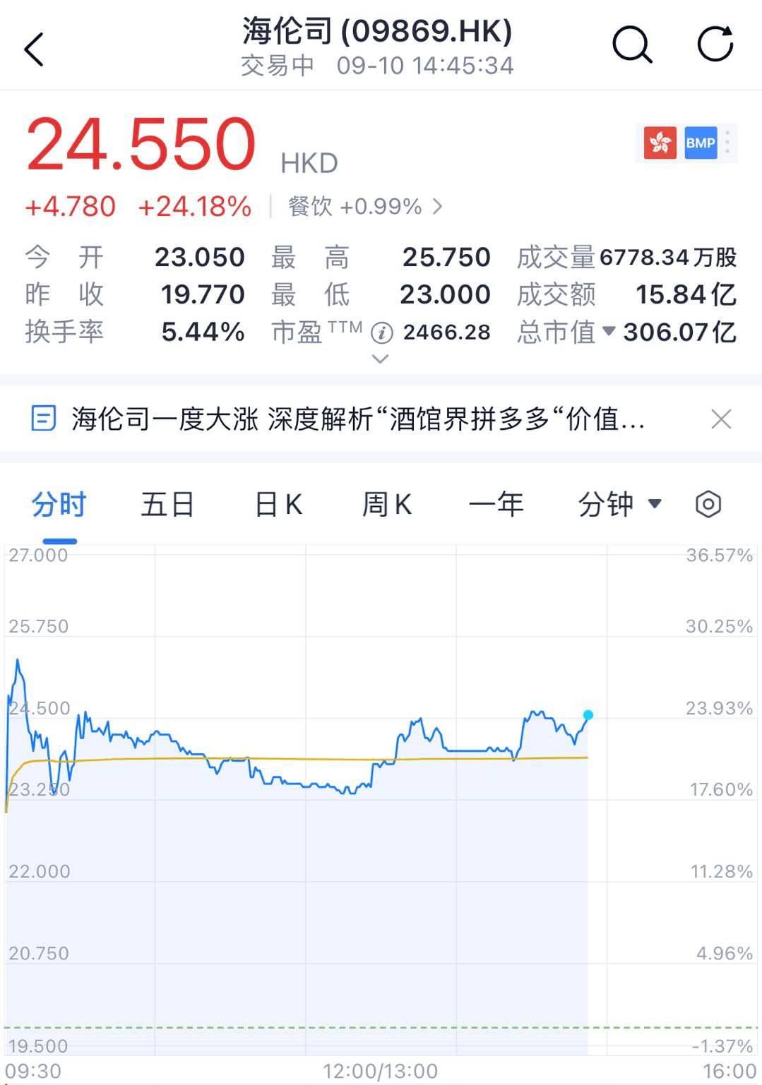 9月10日海伦司正式挂牌交易,开盘即高开16.59%,一度大涨近30%,下午2点45分元,较招股价19.77港元上24.18%,一手即赚2400港元左右,市值306亿港币。