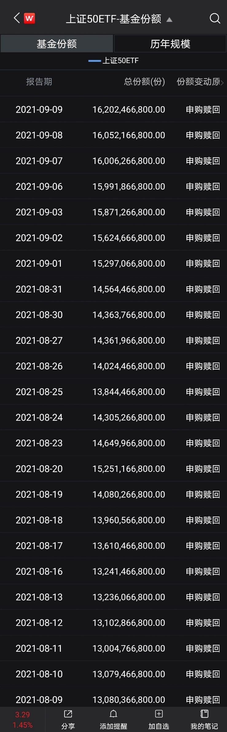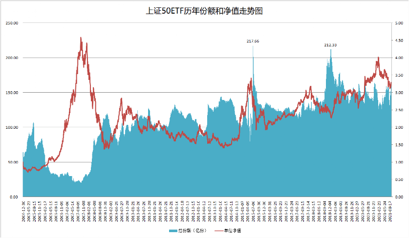 2018年熊市期间,上证50指数大跌近20%,但是在市场大跌中,资金同样是“越跌越买”,在股市底部收集了足够多的筹码,并在2018年底的总份额达到212亿份,逼近历史规模的最高点。而在此时,该指数也跌至当年的最低点。