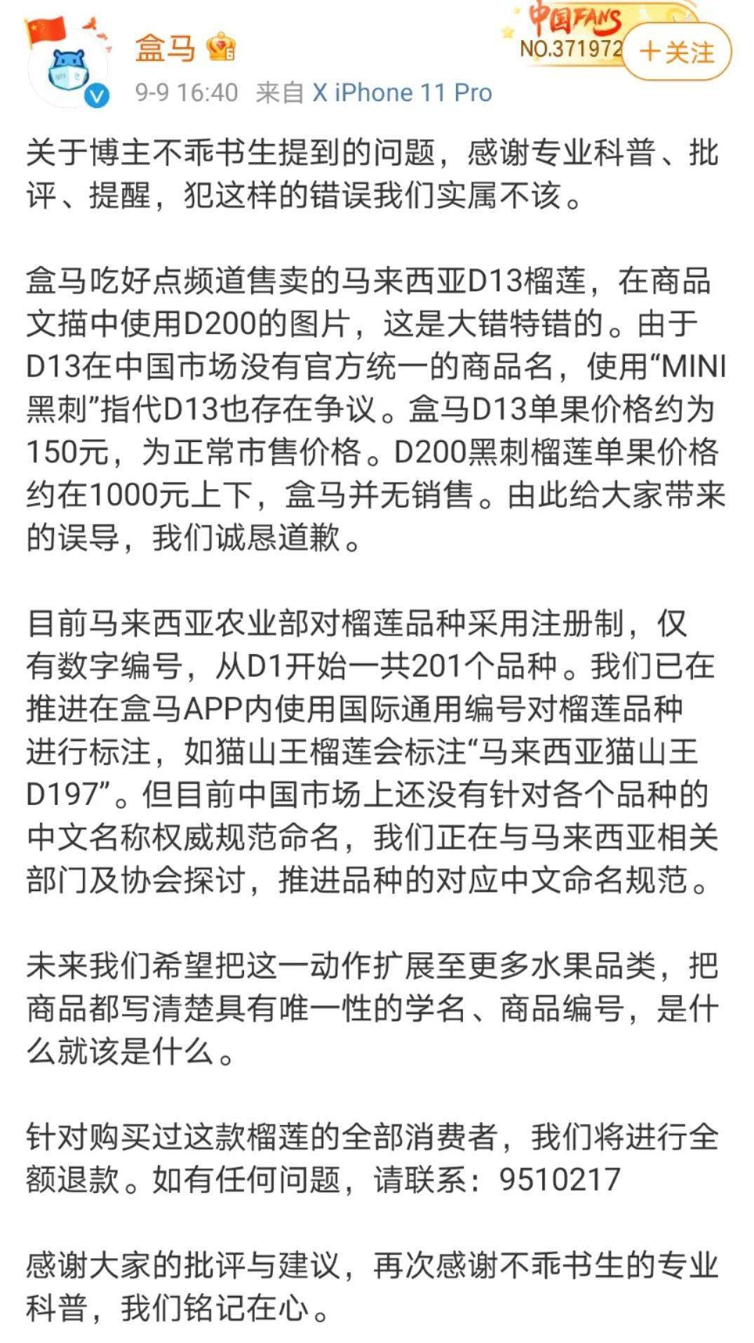 对此,盒马官方微博9月9日发文道歉,承认存在误导,售卖的马来西亚D13榴莲在商品文描中使用了D200的图片,盒马表示针对购买过这款榴莲的全部消费者,将全额退款。