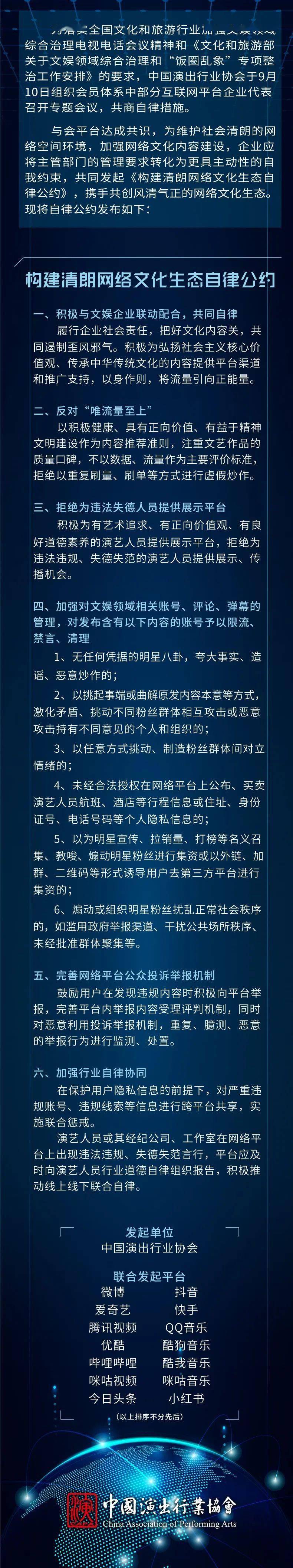 由中国演出行业协会联合微博、爱奇艺、腾讯视频、优酷、哔哩哔哩、咪咕视频、今日头条、抖音、快手、QQ音乐、酷狗音乐、酷我音乐、咪咕音乐、小红书14家平台共同发起的《构建清朗网络文化生态自律公约》11日发布。