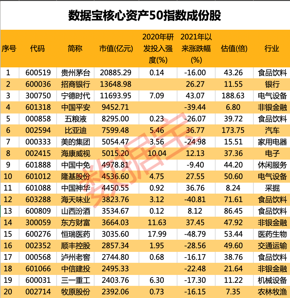 调仓之后,数据宝核心资产50股总市值15.46万亿元。白酒、锂电池及银行板块的 贵州茅台、宁德时代和 招商银行市值超万亿; 良信电器及新进纳入的 天顺风能市值相对较低,在200亿元以下。