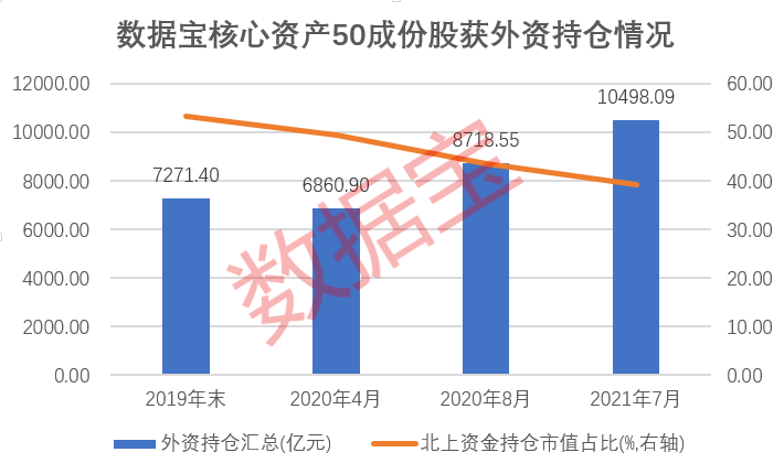 从外资持仓(北上资金+QFII)来看,最新数据显示, 外资持仓突破万亿,2019年末持仓市值不到7500亿。从北上资金持有核心资产市值占比来看(相较于陆股通成份股的持仓),2019年末超过50%,当前下滑至40%左右。