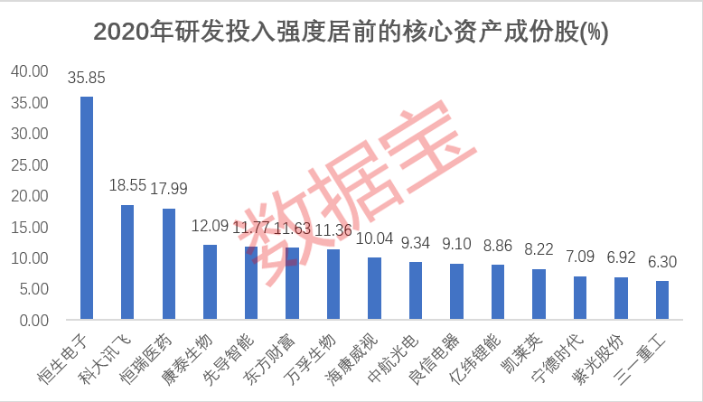 调仓后,核心资产对传统行业及新兴产业间的配置更加均衡,科技含金量不断提升。数据宝统计,核心资产成份股整体研发投入强度由2019年的2.18%提升至2020年的2.21%, 调仓之后,研发投入强度上升至2.51%。