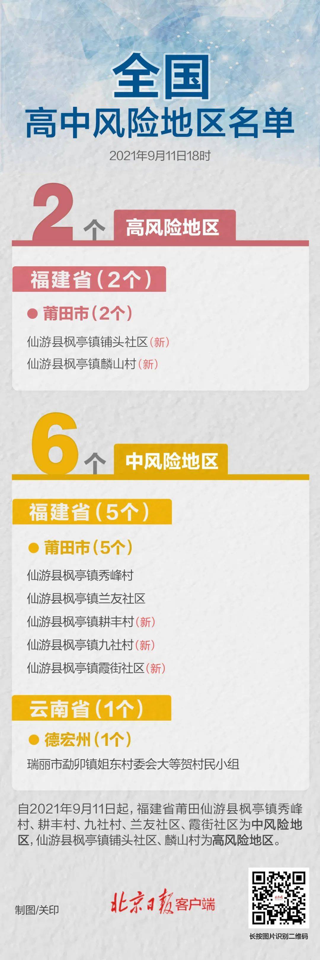 根据流调结果,判定莆田市仙游县枫亭镇秀峰村、耕丰村、九社村、兰友社区、霞街社区为中风险地区;仙游县枫亭镇铺头社区、麟山村为高风险地区。